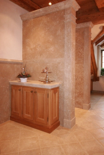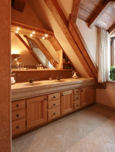 Welche überraschenden Möglichkeiten die Nutzung eines Dachgeschosses bieten kann, zeigt dieses Badezimmer. Die Altholzdecke und französischer Kalkstein für Boden und Naßbereich schaffen eine wohnliche Atmosphäre. Die Möbel wurden in massiver Eiche mit geölten Oberflächen angefertigt und fügen sich harmonisch in den Raum ein. Die traditionelle Anfertigung der Schränke mit gefälzten Türen und sichtbaren Bändern ist zeitlos in der Erscheinung und garantiert jahrzehntelange Funktion. Schübe und Auszüge in Massivholz schaffen Komfort bei der Unterbringung der nötigen Utensilien im Bereich der Waschplätze.