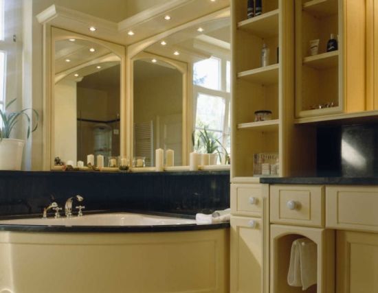 Diese Badeinrichtung wurde im klassischen Landhausstil gefertigt. Die Möbel und Wannenverkleidung aus Massivholz sind farbig lackiert. Die Steinplatte am Waschtisch und die Wannenrandabdeckung sind in grünem Marmor ausgeführt. Die großzügige Atmosphäre des Raumes wird durch die großen Spiegel über der Badewanne geschickt genutzt.