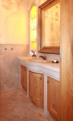 In diesem kleinen Gästebad sind die Schrankelemente mit teilweise geschweiften Fronten unter dem Natursteinwaschtisch in die Nischen der Steinsäulen eingepasst. Der geschwungene Frontverlauf von Waschtisch und Möbel wirkt harmonisch und zurückhaltend in diesem kleinen Raum.