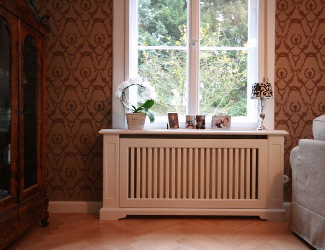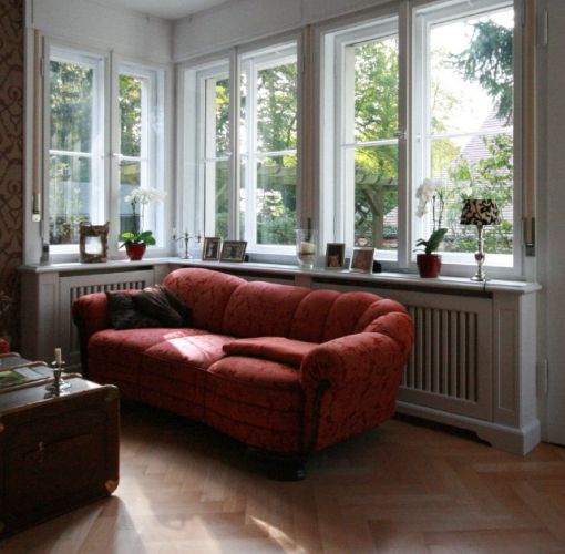 Die Heizkörperverkleidungen sind in der Gestaltung traditionellen Vorbildern entlehnt und beseitigen in diesem Wohnzimmer den störenden Anblick von Plattenheizkörpern und Heizungsrohren. Durch den Einbau unter den historischen Kastenfenstern entsteht zudem eine großzügige Fensterbank für Pflanzen und Dekoration. Die Verkleidungen sind komplett in Massivholz gefertigt und haben eine handgestrichene Lackierung erhalten. Somit fügen sie sich harmonisch in den Baubestand ein und schaffen eine wohnliche Atmosphäre.