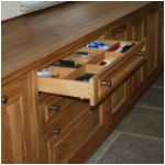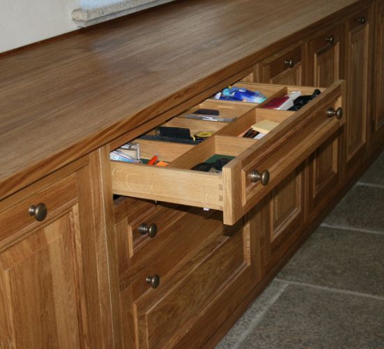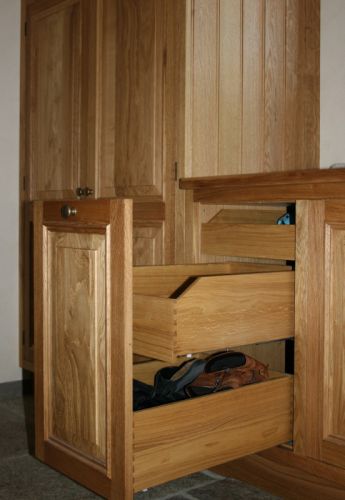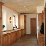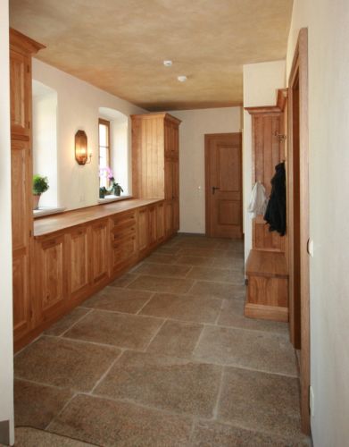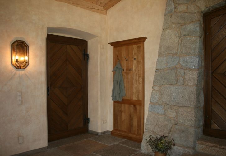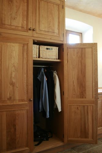 Dieses Flurmöbel in einem Landhaus wurde in klassischer Möbelbauweise in Eiche gefertigt. Es dient mit den beiden großen Kleiderschränken der